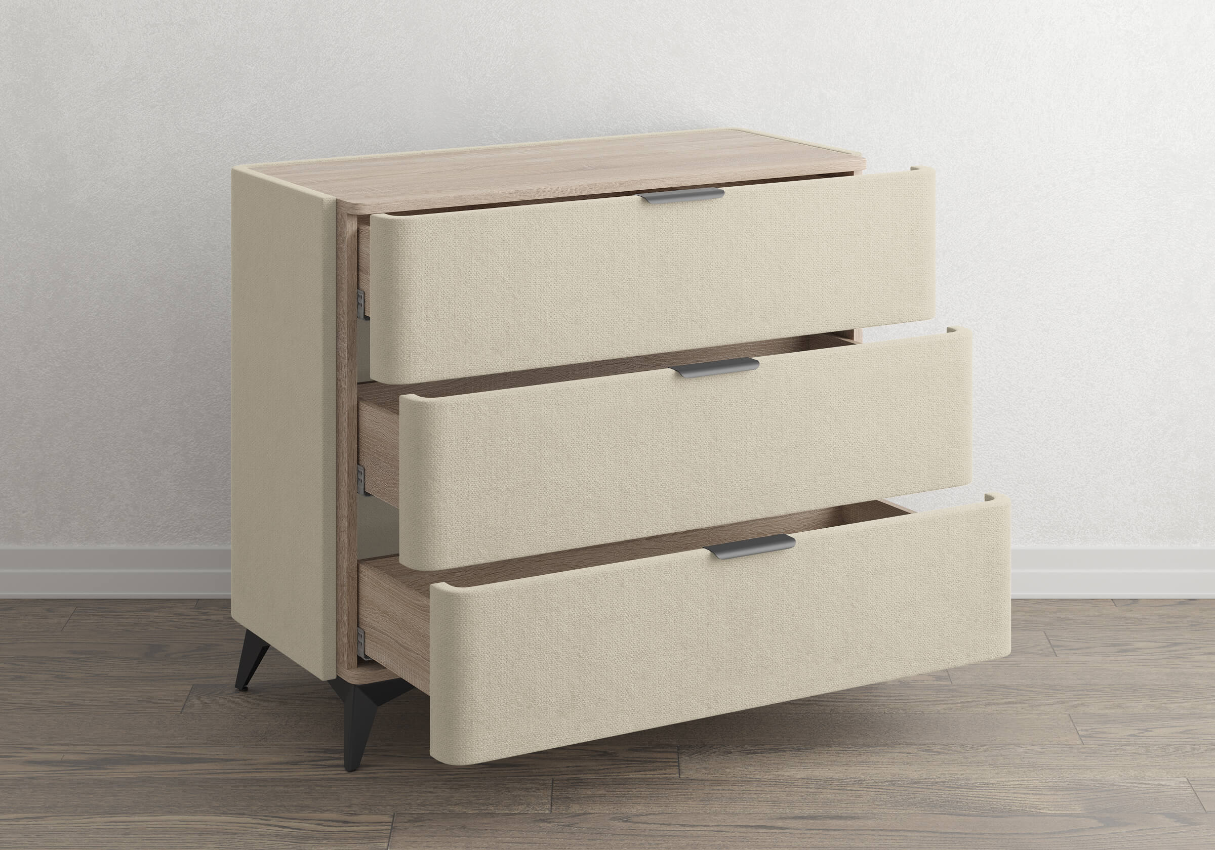 Высокие черные металлические ножки придают комоду не только устойчивость, но и особую выразительность. Этот элемент дизайна подчеркивает современный стиль мебели, добавляя ей элегантность.